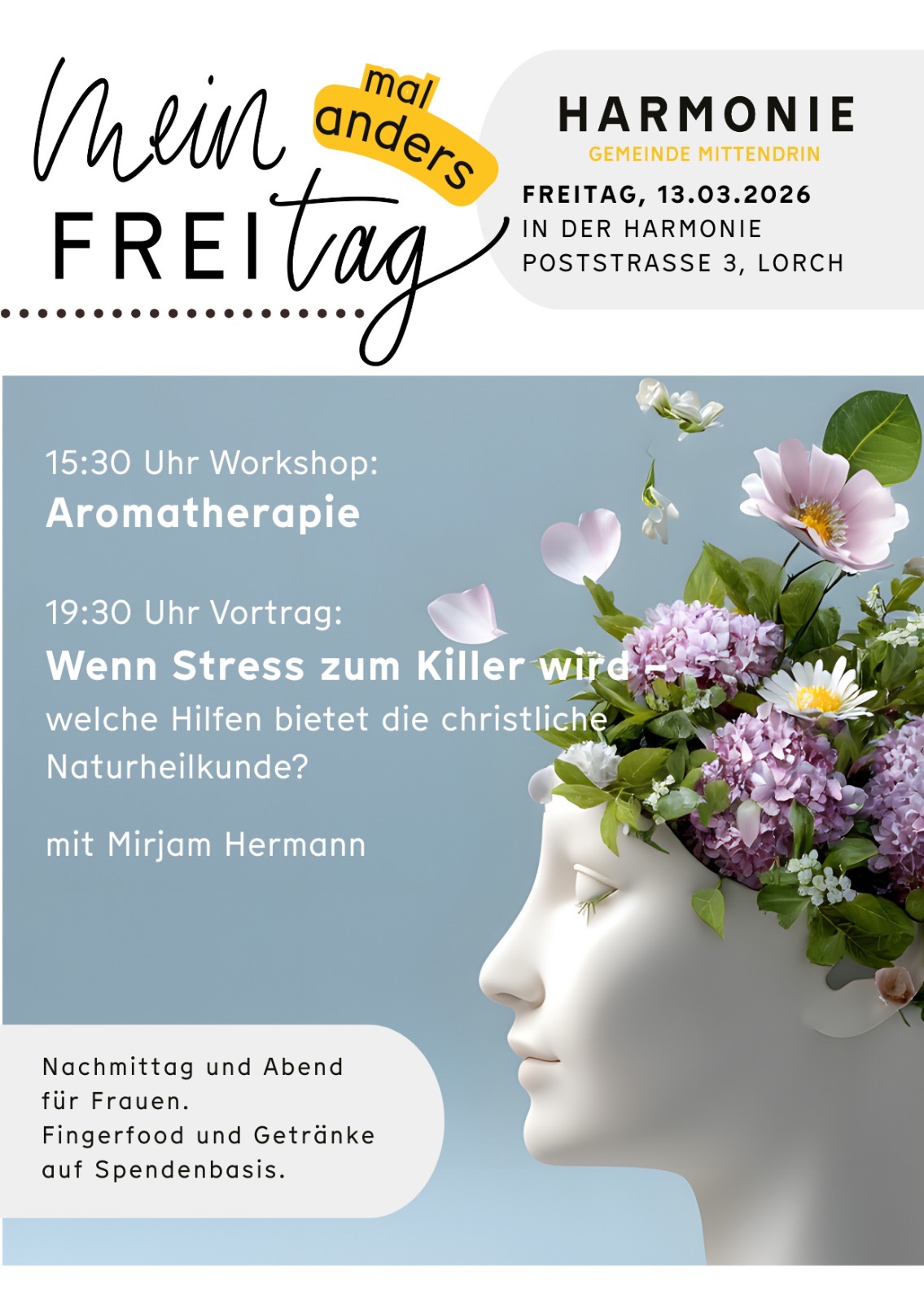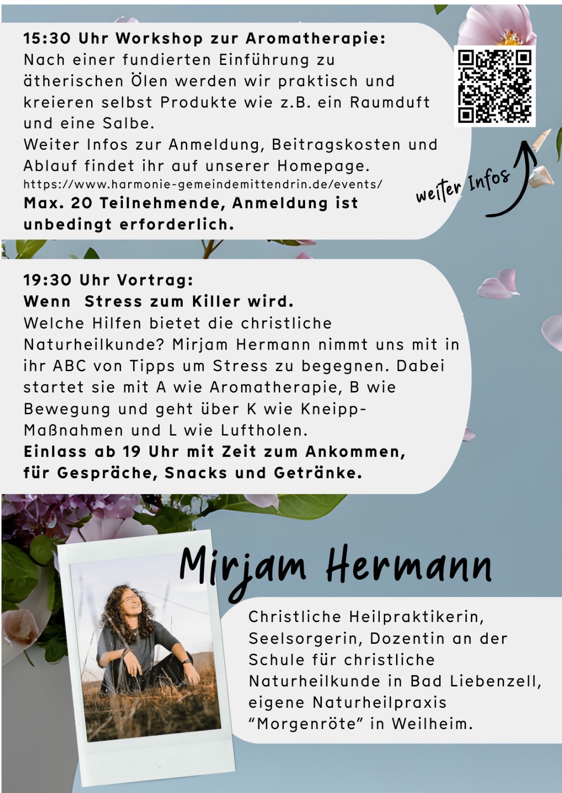 Nach einer fundierten Aromatherapie-Einführung gibt es im praktischen Teil Zeit um unter Anleitung selbst etwas zu kreieren, z. B. ein Raumduft oder eine Salbe. Zwischen Workshop und Vortrag (ca. 18:30 Uhr) gibt es einen kleinen Imbiss für alle Teilnehmenden.
